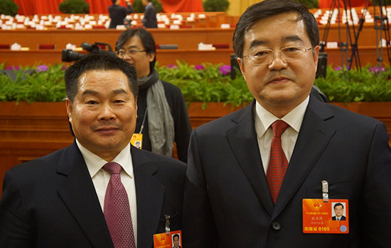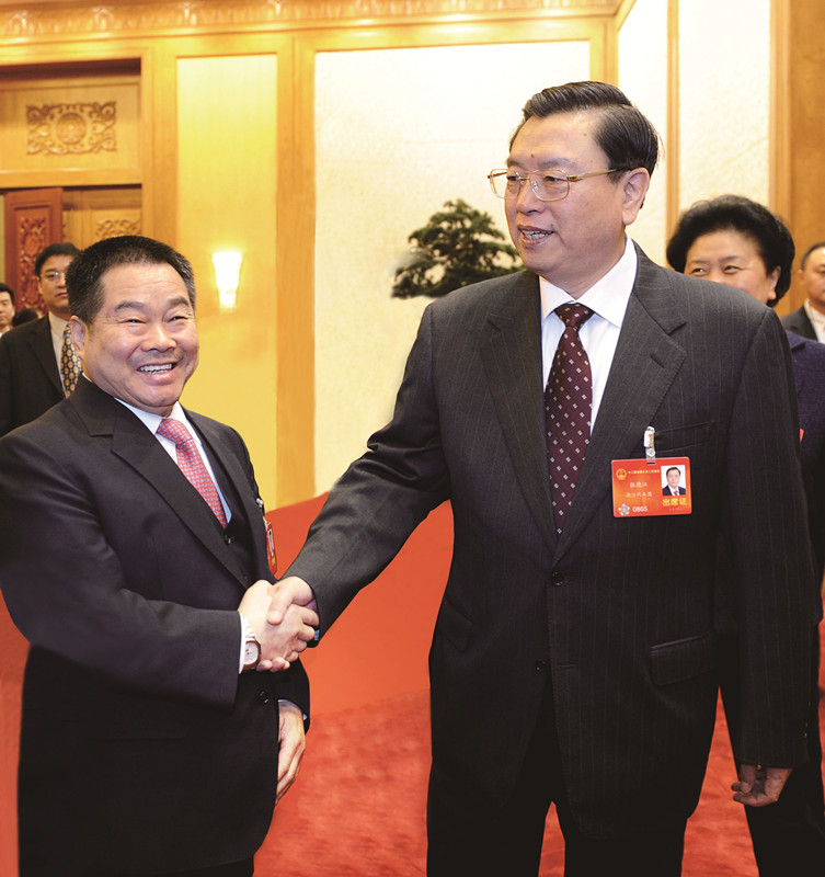 2014年三月,十二屆全國人大二次會議期間,中共中央政治局常委、十二屆全國人大常委會委員長張德江與董事局主席吳振山親切合影