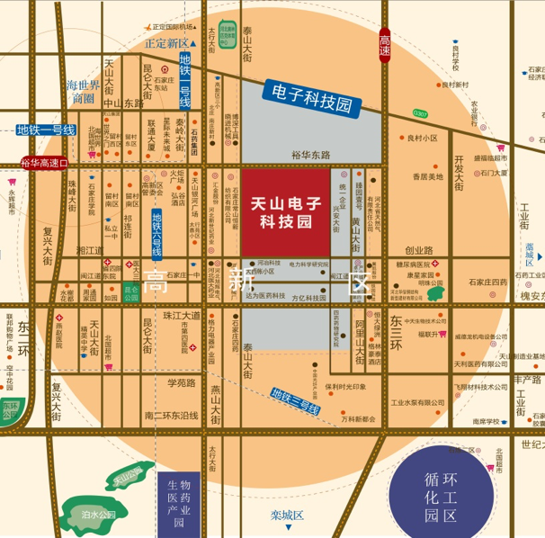 地河電子科技園立足石家莊高新技術産業開發區,區位優勢和産業基礎樂觀可見,是全國首批國家級高新區,“一小時交通圈”覆蓋北京、天津、雄安新區、濟南等區域重點城市,緊鄰正定國際機場可通航全球82個城市,坐落在高新區北部的石家莊東站,可直接聯通長三角經濟圈,區位優勢非常明顯、交通十分便利。