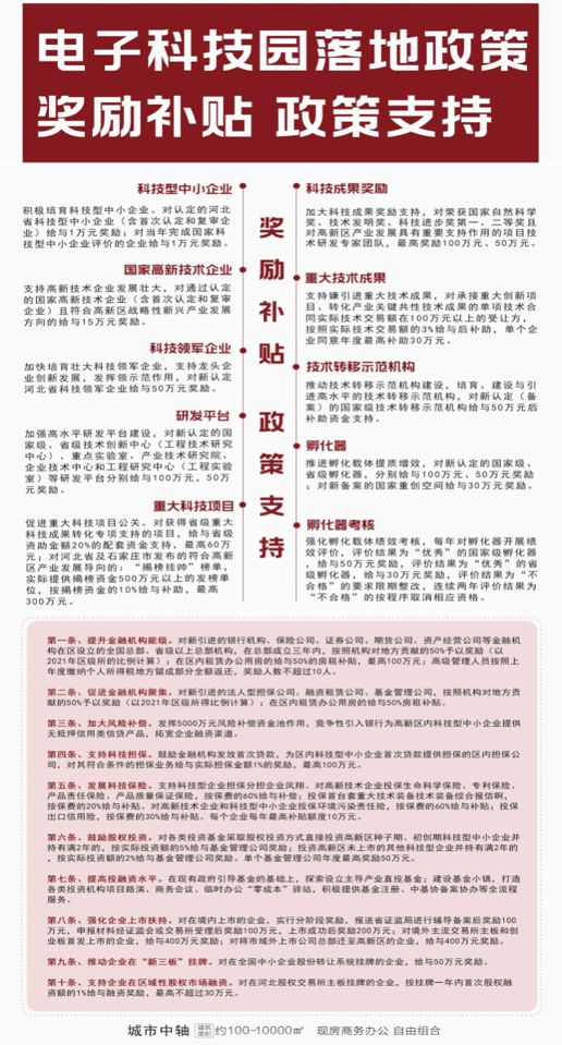 地河電子科技園作為河北省首家高新科技産業園區,2014年被評為省級科技企業孵化器,2016年被評為國家級孵化器,現有入園企業近500家,其中5家已成功孵化上市,成為省會孵化上市企業最多的科技園區,也是河北省乃至華北地區最有影響力的科技園區的樣闆工程之一。其中ABCD棟為現房,面積段從100-10000平米自由組合,中心規劃4 3層廠房和3棟高層廠房,可根據企業需求定制開發,現面向全國進行招商。