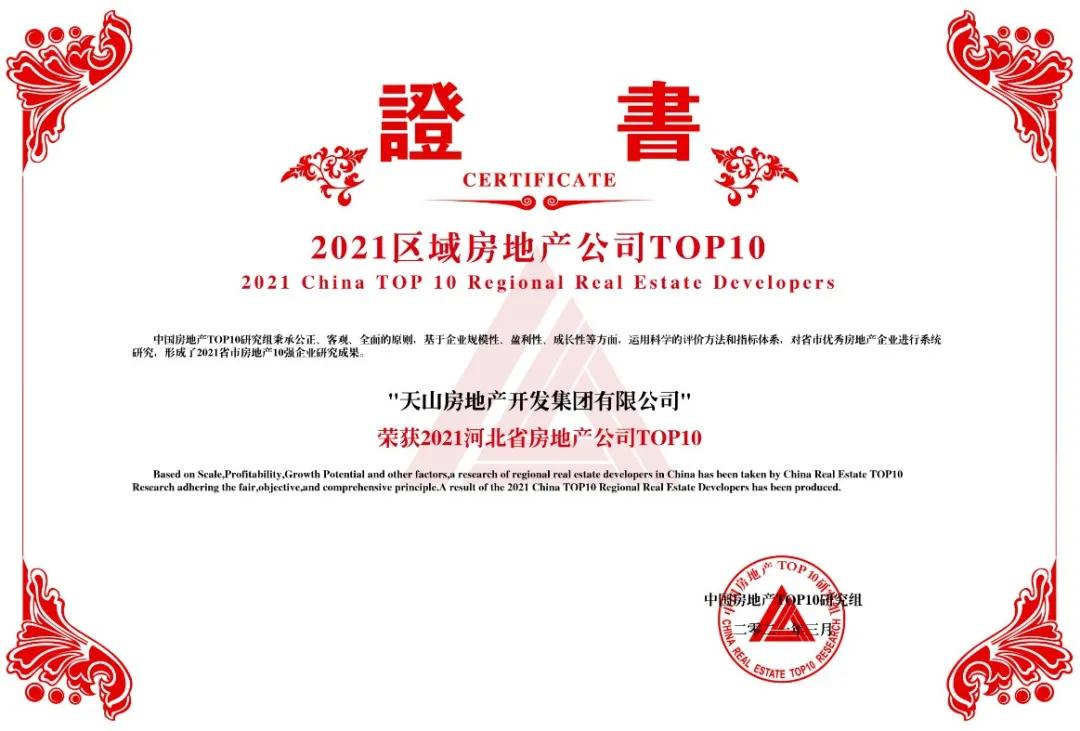 地河房地産開發集團有限公司始終秉承“品質如天、誠信如山”的經營理念,赢得了廣大客戶、合作夥伴、業内同行的尊重和贊譽,榮膺“2021中國房地産百強企業”、“2021中國房地産百強之星”、“2021河北省房地産公司TOP10”榮譽。自2013年榮獲百強以來,這已經是金年会連續第九年獲評中國房地産百強企業。